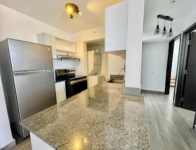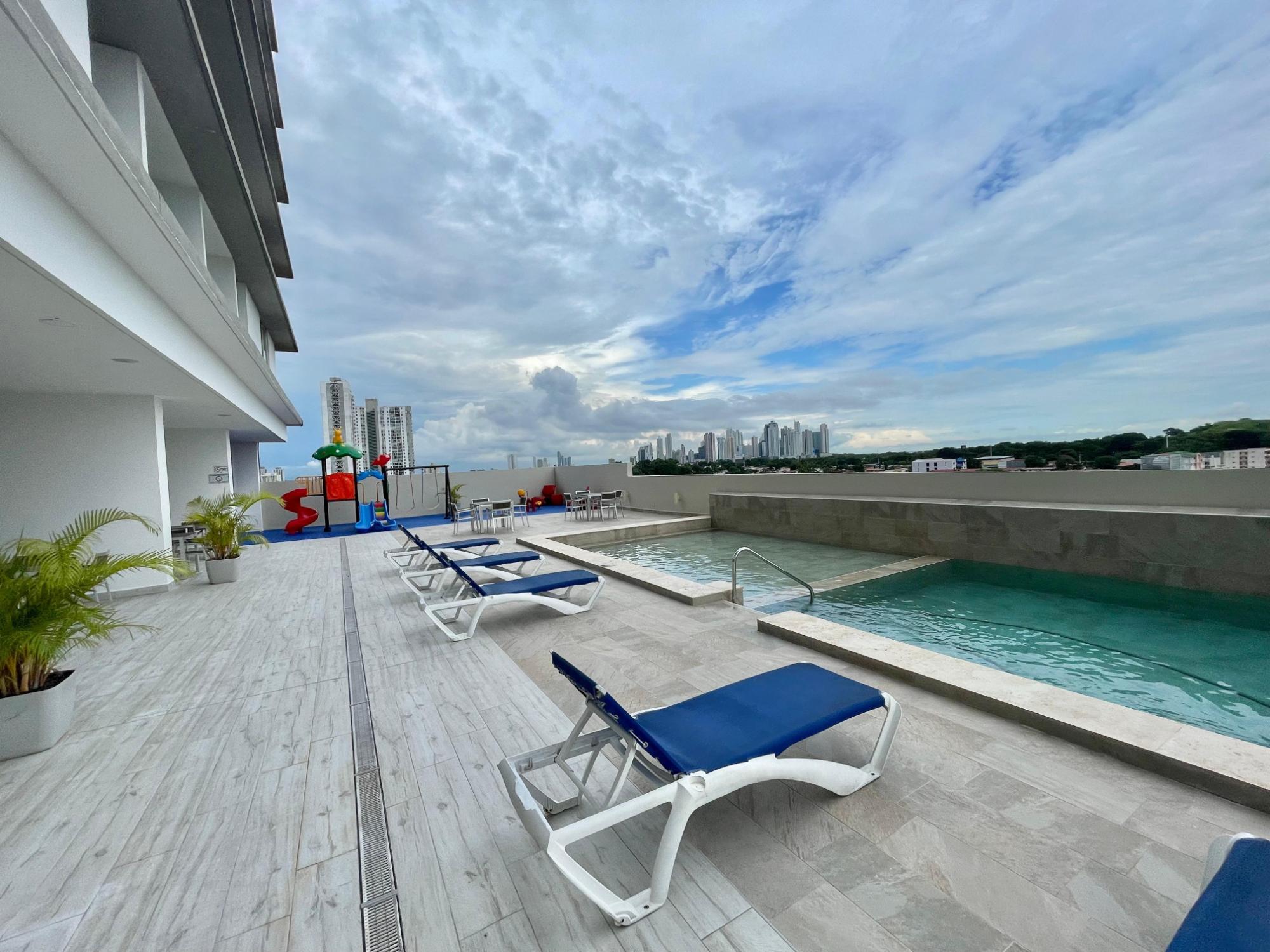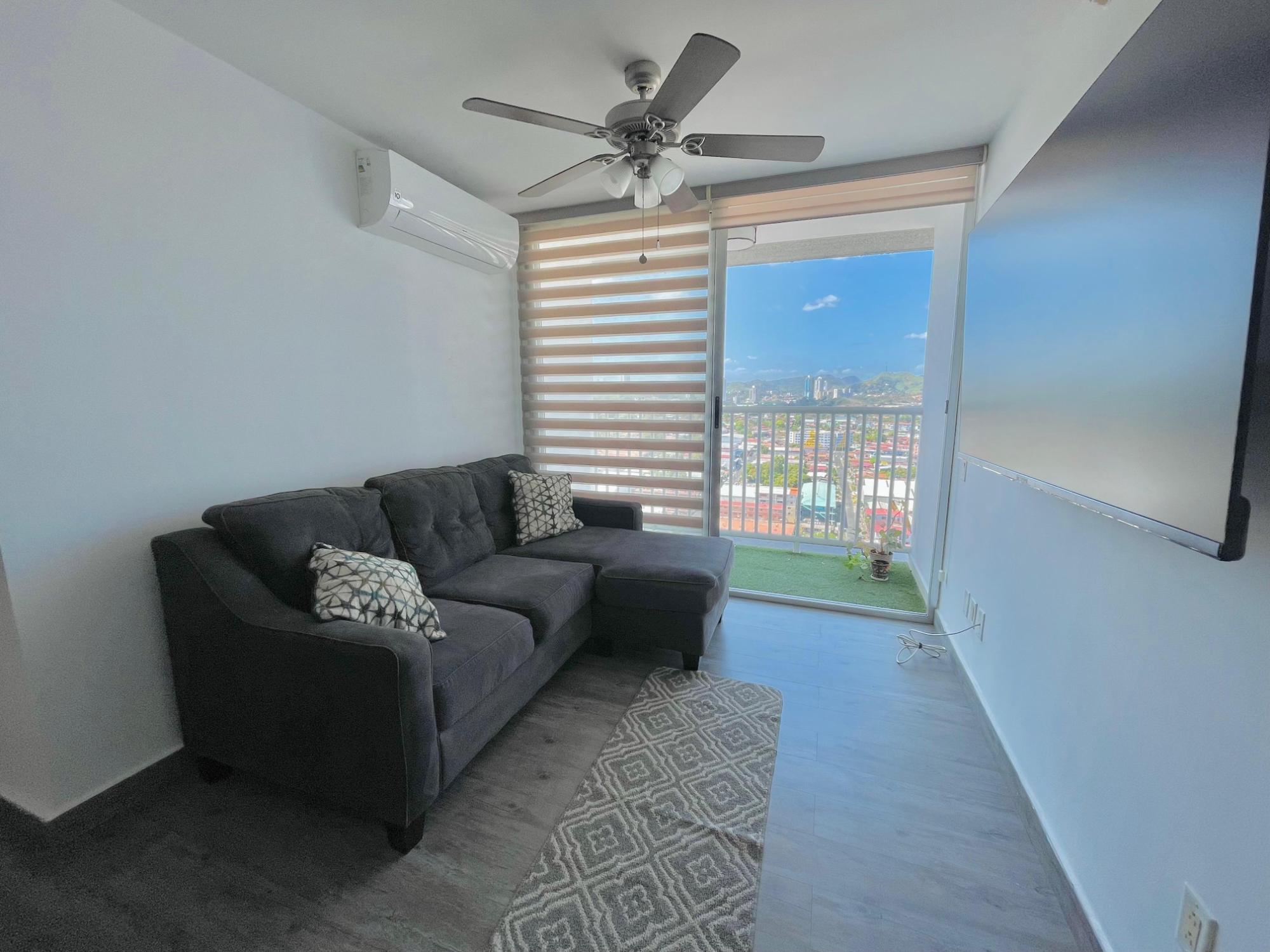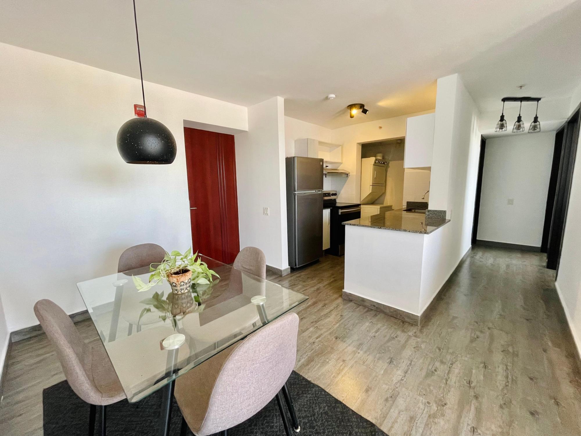 Furnished Apartment for Rent in Parque Lefevre - PH Alegría PH Alegría has an excellent strategic location on Vía España, close to supermarkets, pharmacies, bakeries, restaurants and minutes from Costa del Este and San Francisco, due to its different access routes and public transportation. The apartment has: 66m2, 2 bedrooms, 2 full bathrooms, 1 parking, White Line, Inverter air conditioners, Open kitchen with granite countertops, Modern furniture, Lamps and blinds, Remodeled, Balcony. The building has a social area, party room, gym, swimming pool, playground, lobby, power plant, water tank, power plant, visitor parking and 24 hour security.Features