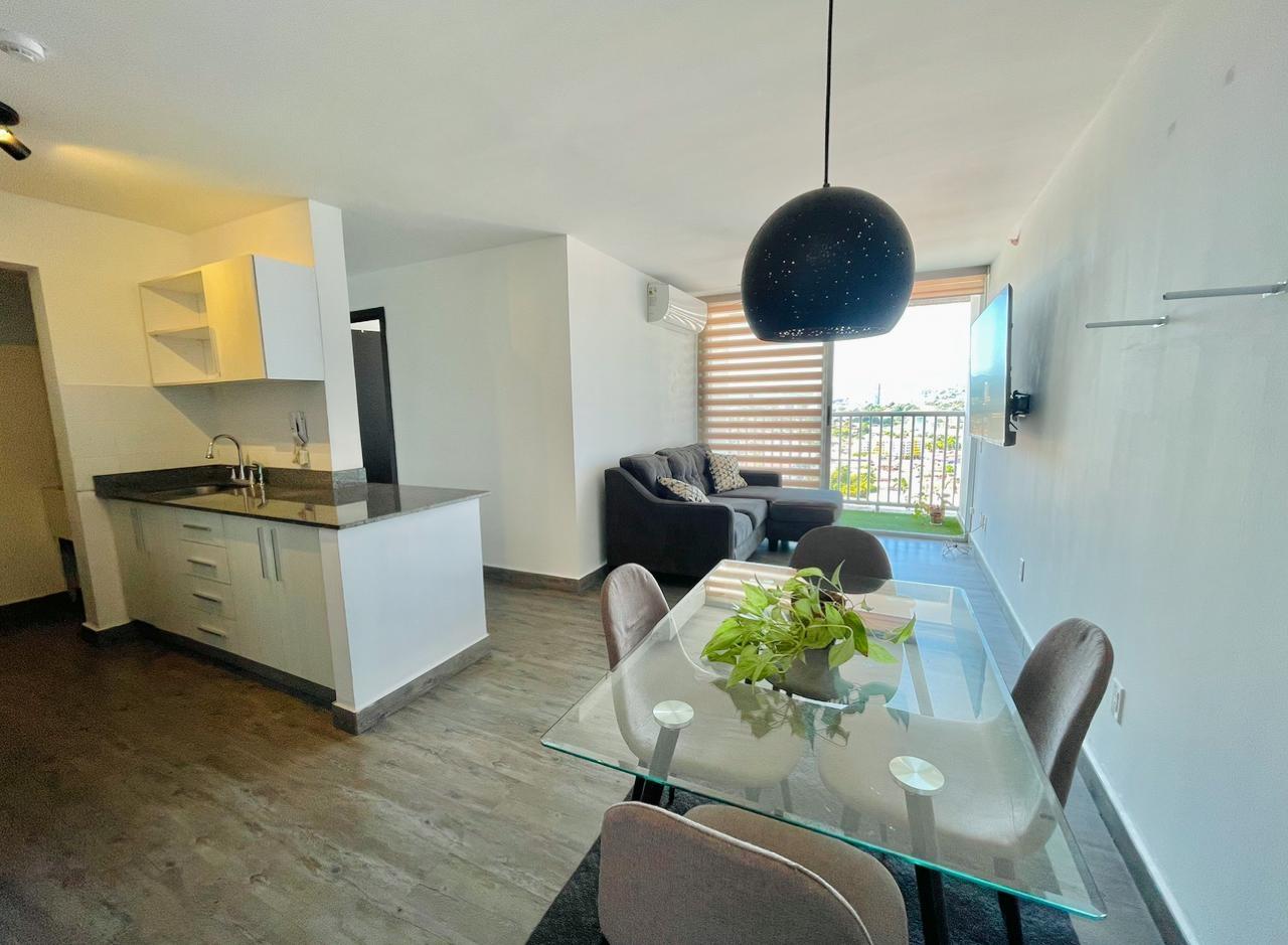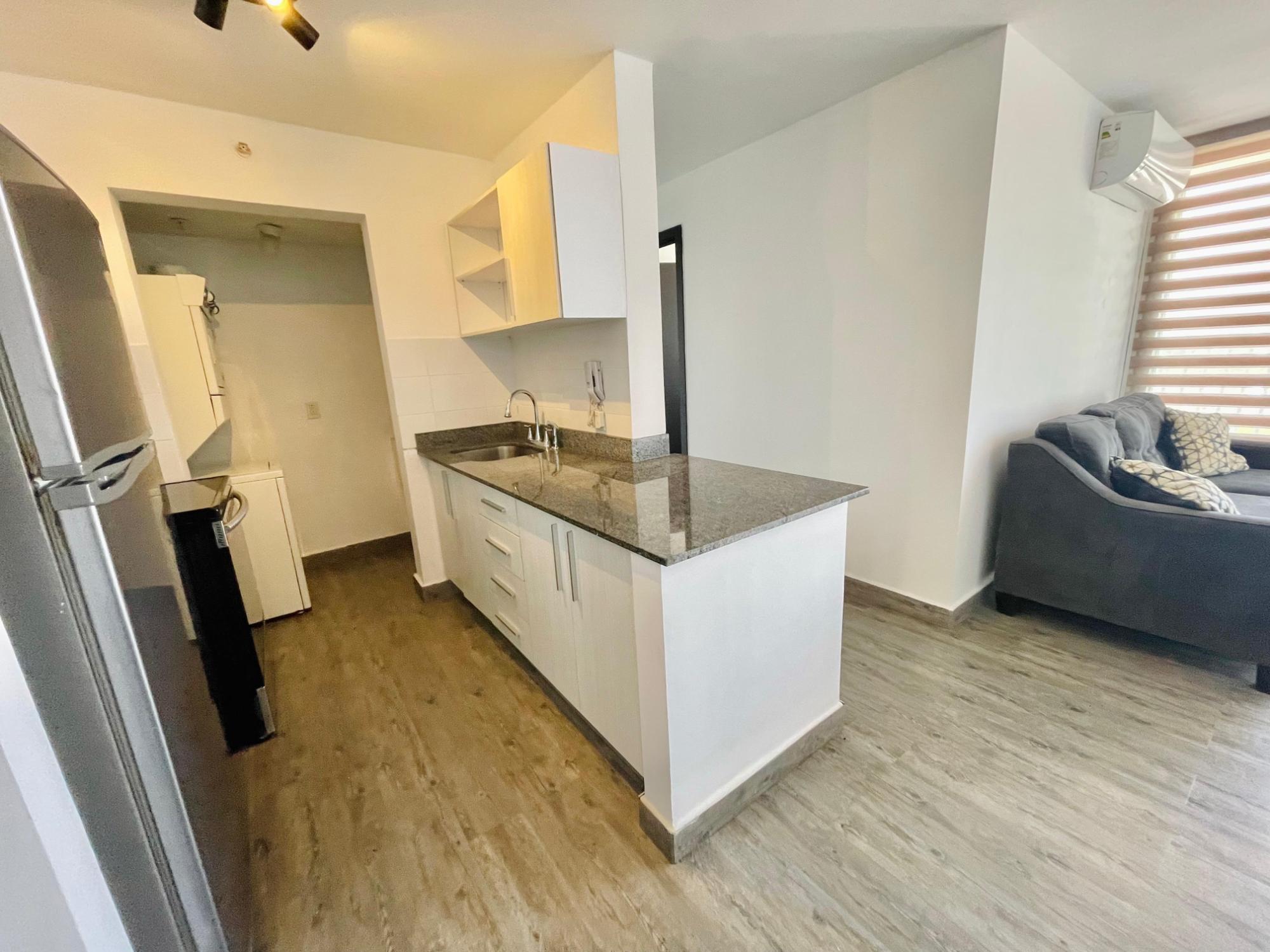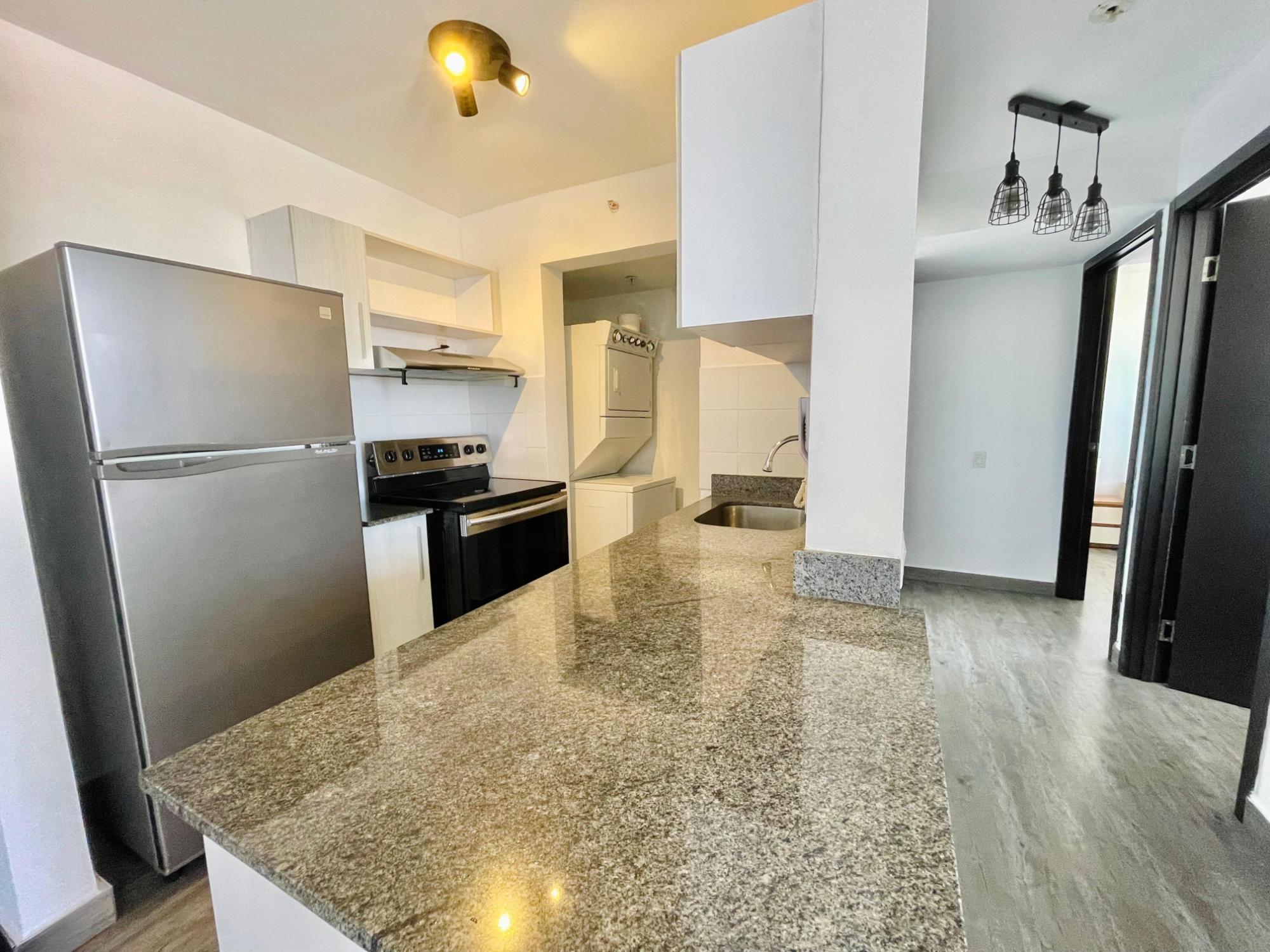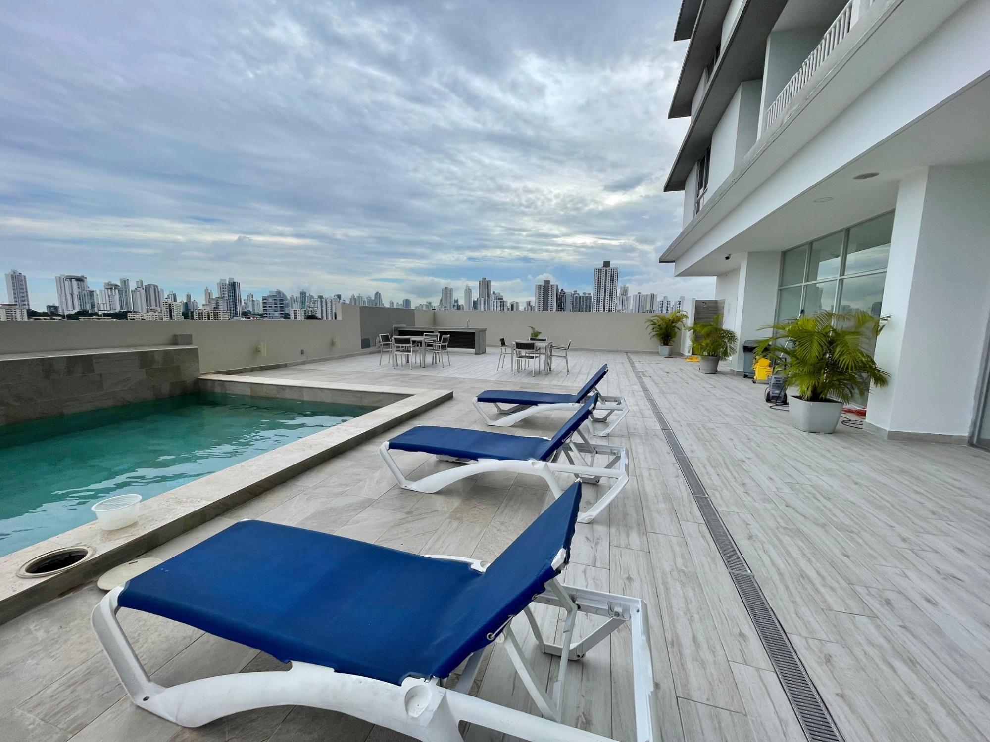 Furnished Apartment for Rent in Parque Lefevre - PH Alegría PH Alegría has an excellent strategic location on Vía España, close to supermarkets, pharmacies, bakeries, restaurants and minutes from Costa del Este and San Francisco, due to its different access routes and public transportation. The apartment has: 66m2, 2 bedrooms, 2 full bathrooms, 1 parking, White Line, Inverter air conditioners, Open kitchen with granite countertops, Modern furniture, Lamps and blinds, Remodeled, Balcony. The building has a social area, party room, gym, swimming pool, playground, lobby, power plant, water tank, power plant, visitor parking and 24 hour security.Features
