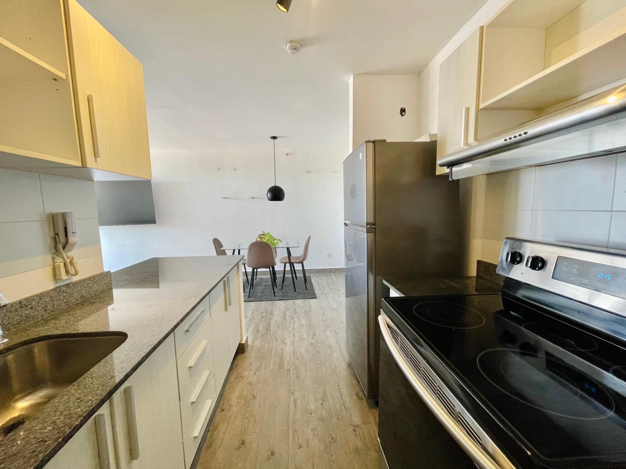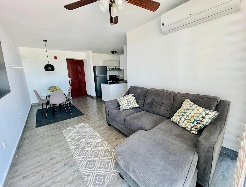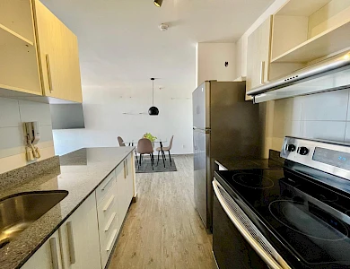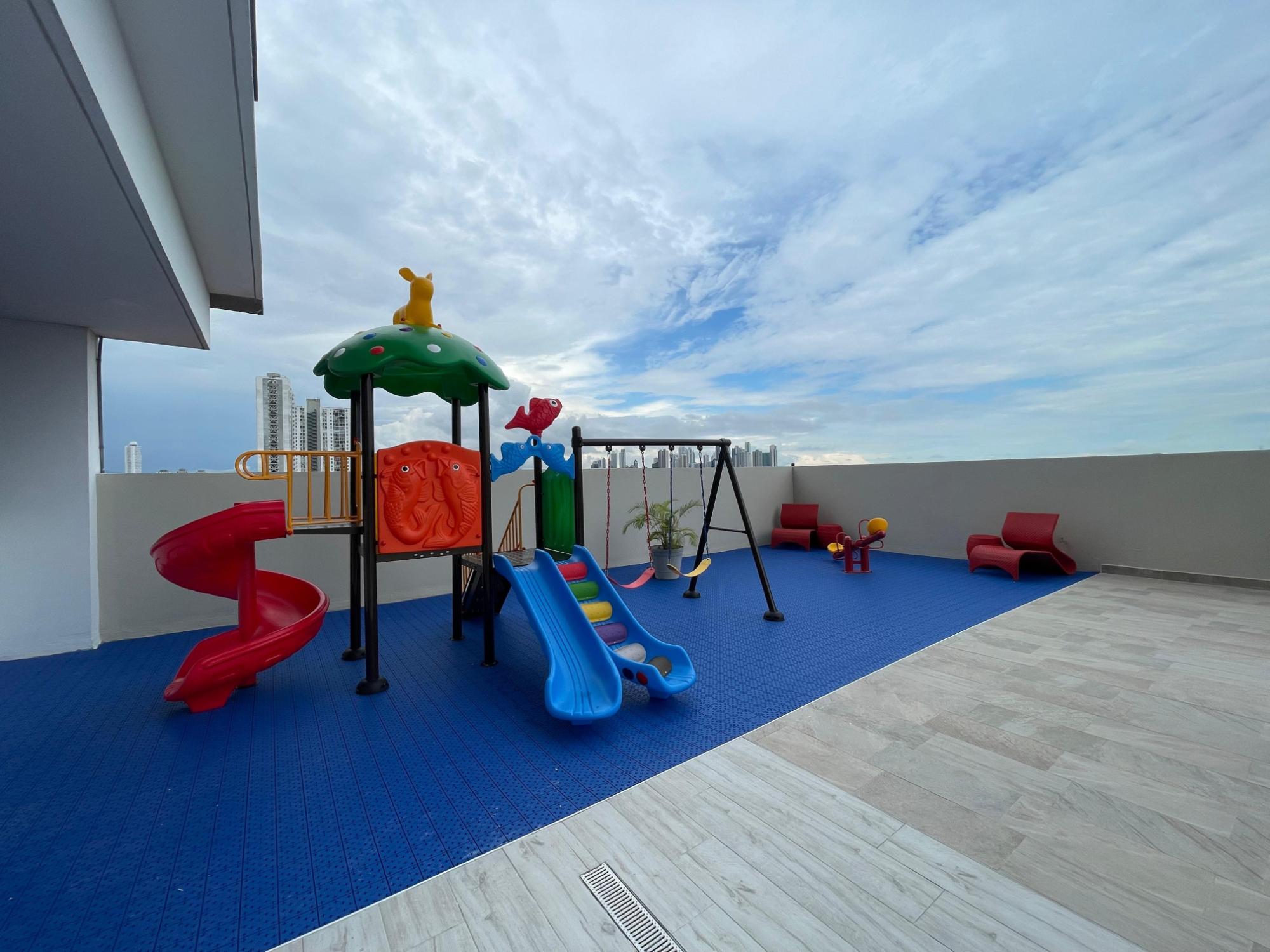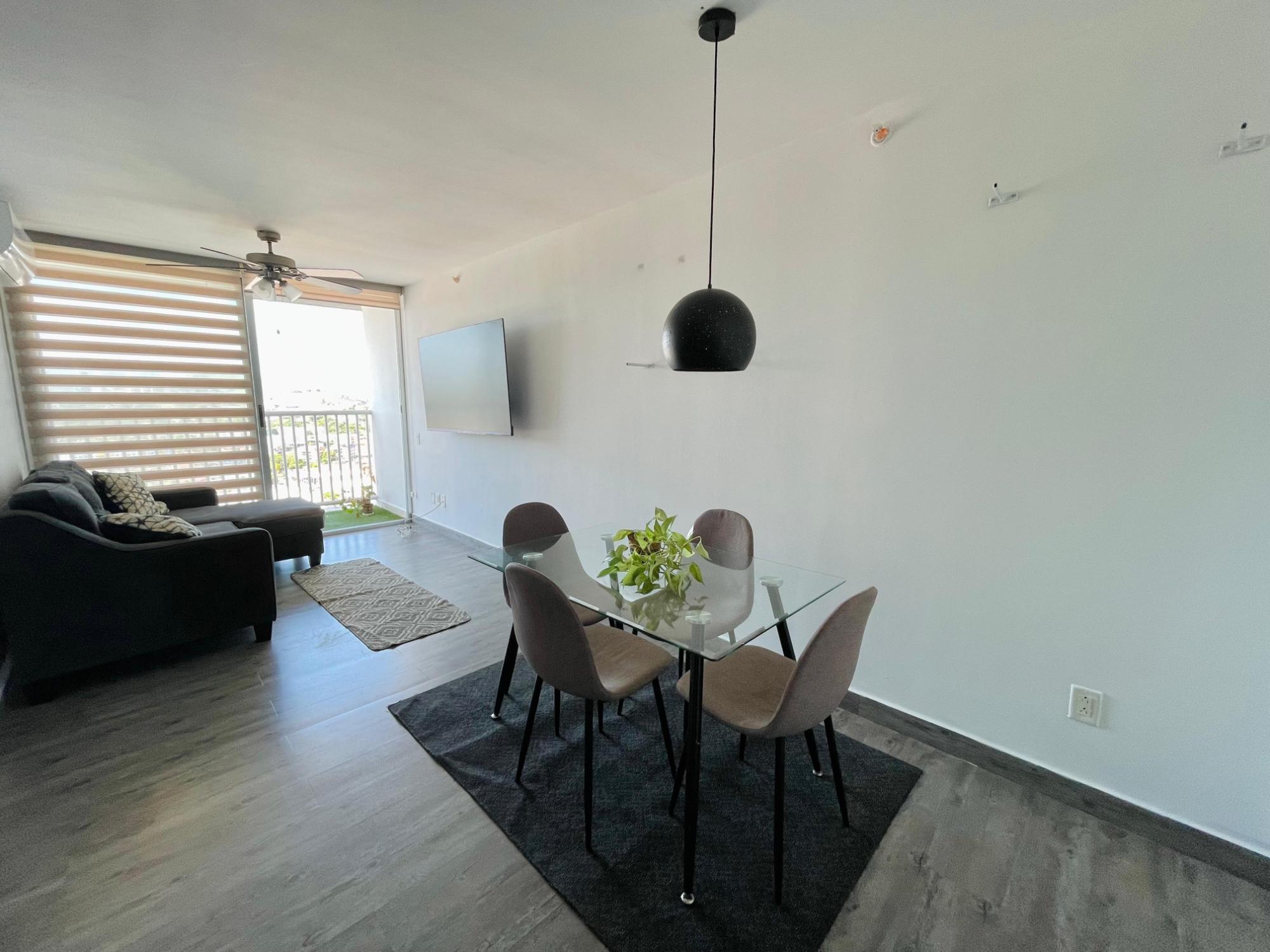 Furnished Apartment for Rent in Parque Lefevre - PH Alegría PH Alegría has an excellent strategic location on Vía España, close to supermarkets, pharmacies, bakeries, restaurants and minutes from Costa del Este and San Francisco, due to its different access routes and public transportation. The apartment has: 66m2, 2 bedrooms, 2 full bathrooms, 1 parking, White Line, Inverter air conditioners, Open kitchen with granite countertops, Modern furniture, Lamps and blinds, Remodeled, Balcony. The building has a social area, party room, gym, swimming pool, playground, lobby, power plant, water tank, power plant, visitor parking and 24 hour security.Features