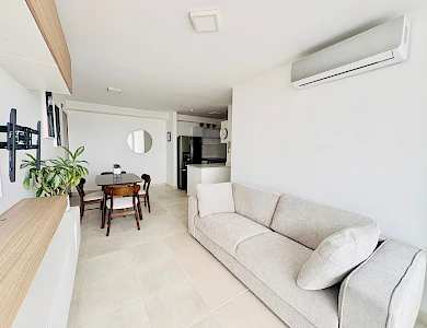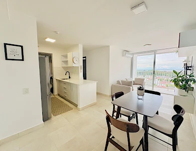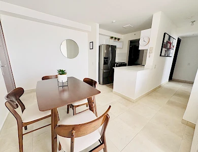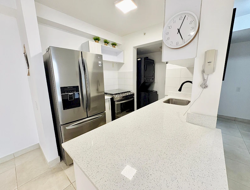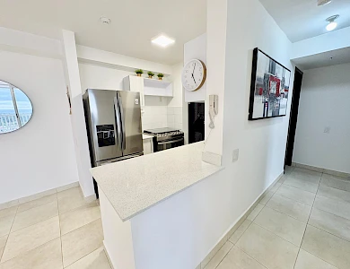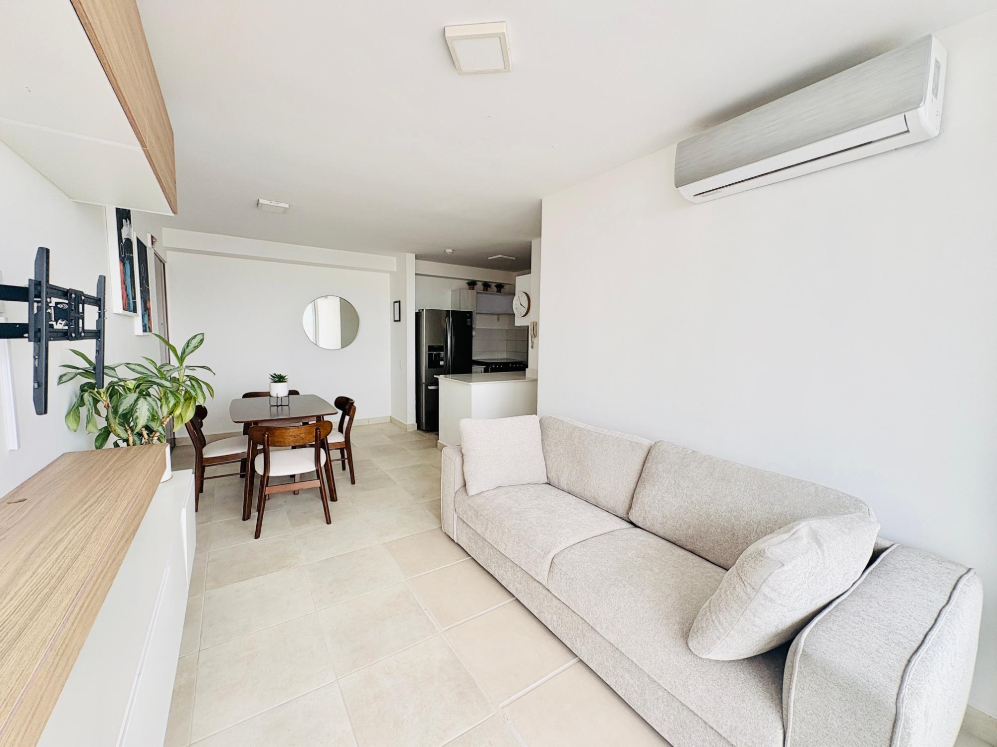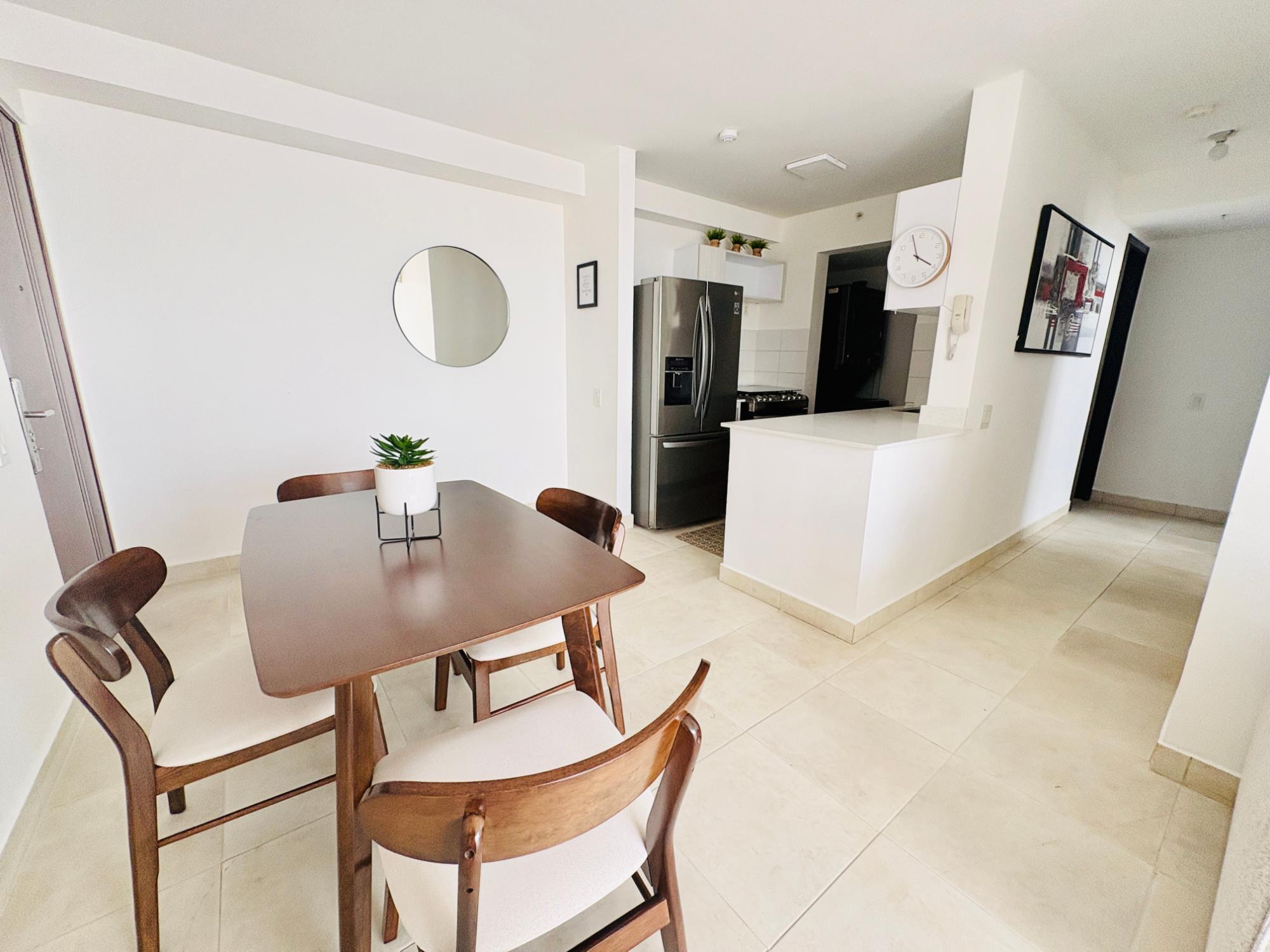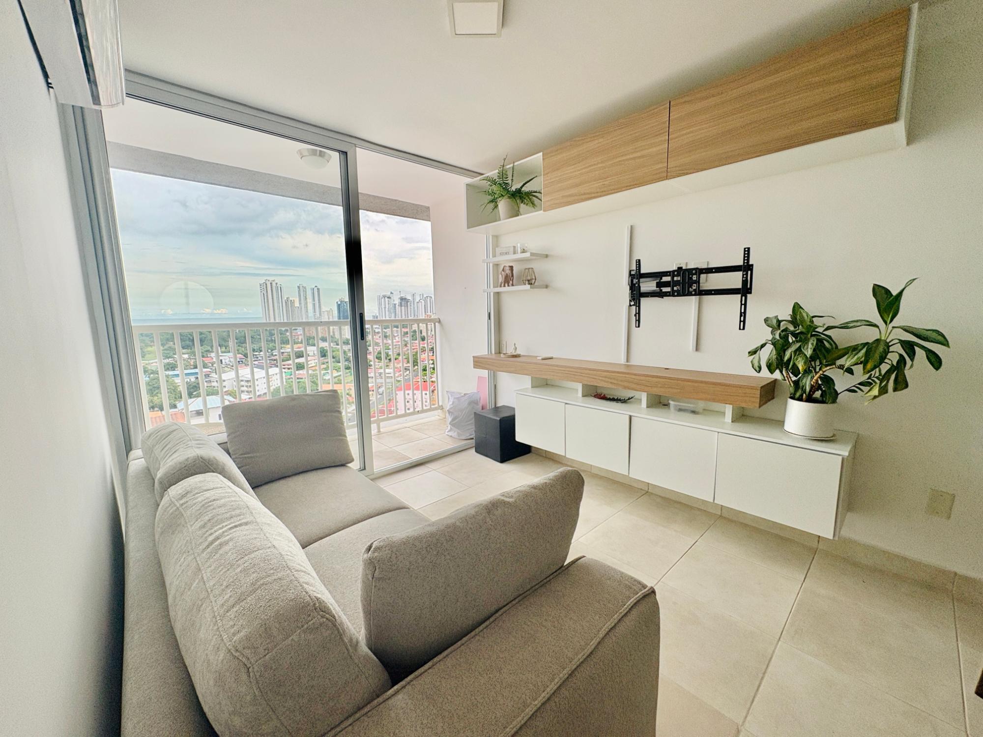 Fully furnished apartment with ocean views, with an excellent strategic location on Via España, close to supermarkets, pharmacies, bakeries, restaurants, and minutes from Costa del Este and San Francisco, due to its different access roads and public transportation. The apartment has: 68m2, 2 bedrooms, 2 full bathrooms, 1 parking space, appliances, inverter air conditioners, open kitchen with white quartz countertops, fully modern furniture, remodeled, lamps and blinds, balcony with ocean views. The building has a social area, party room, gym, swimming pool, playground, lobby, power plant, water tank, power plant, visitor parking, and 24-hour security.Features