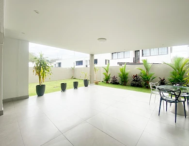 Modern modern house of 389 m2 San Telmo with large patio in a new and exclusive residential located in Altos de Panamá - Barrio Alto It has: UPSTAIRS - 3 bedrooms - 3 bathrooms - den - balcony GROUND FLOOR - living room - dining room - den - kitchen - 1/2 guest bathroom - service room and bathroom - storage room - terrace - patio - 2 parking spaces AMENITIES Club House with gym, event room, BBQ, semi-Olympic pool, children's pool and jacuzzi. Sports area with multipurpose court, paddle tennis, wet bar and biosaludable equipment. Children's area with playground, games, multipurpose room and ecological benches. Outstanding benefits: Modern house ready to move in Gated residential area with 24/7 security Large patio to enjoy with the family Exclusive and quiet communityFeatures
