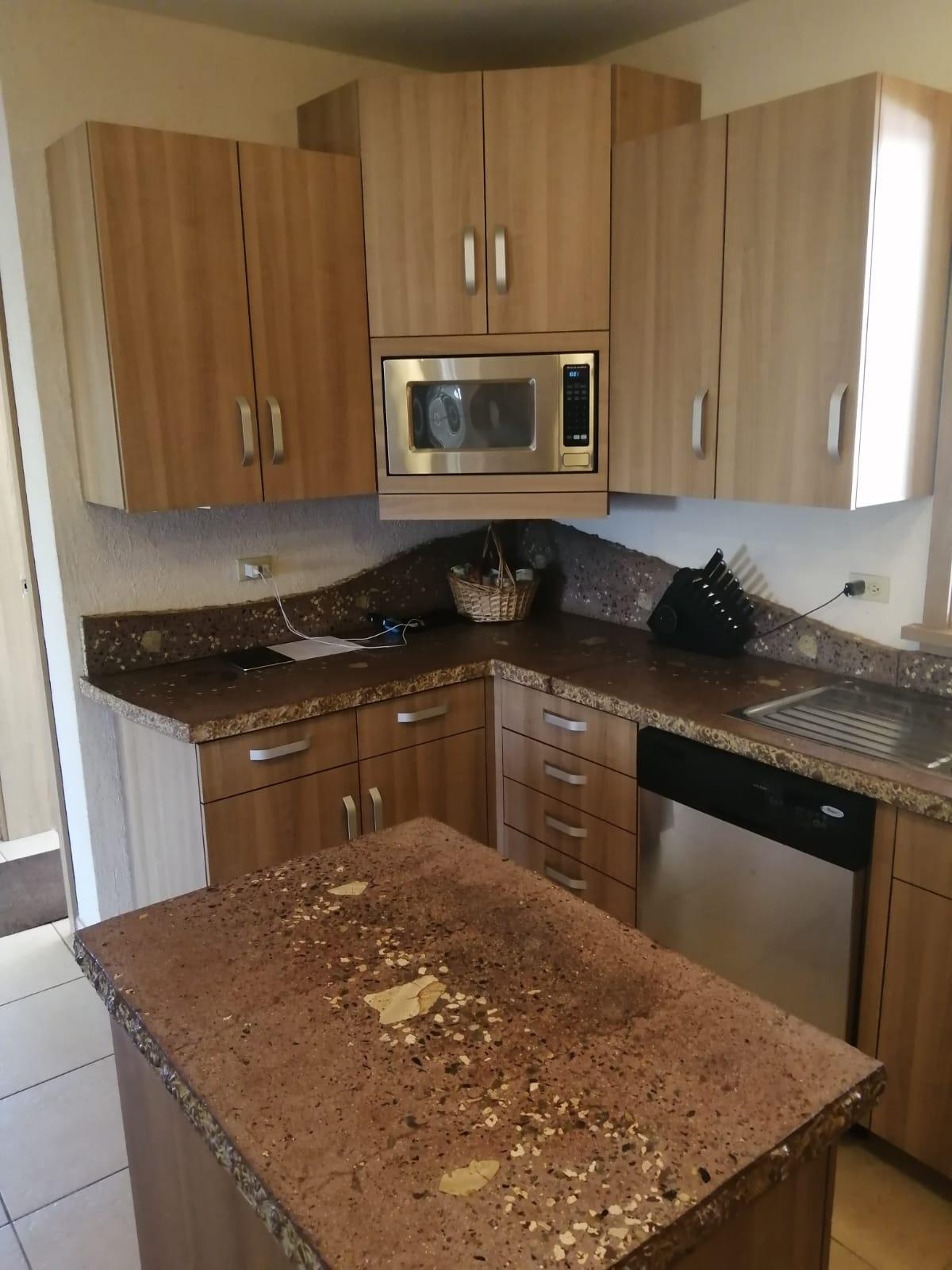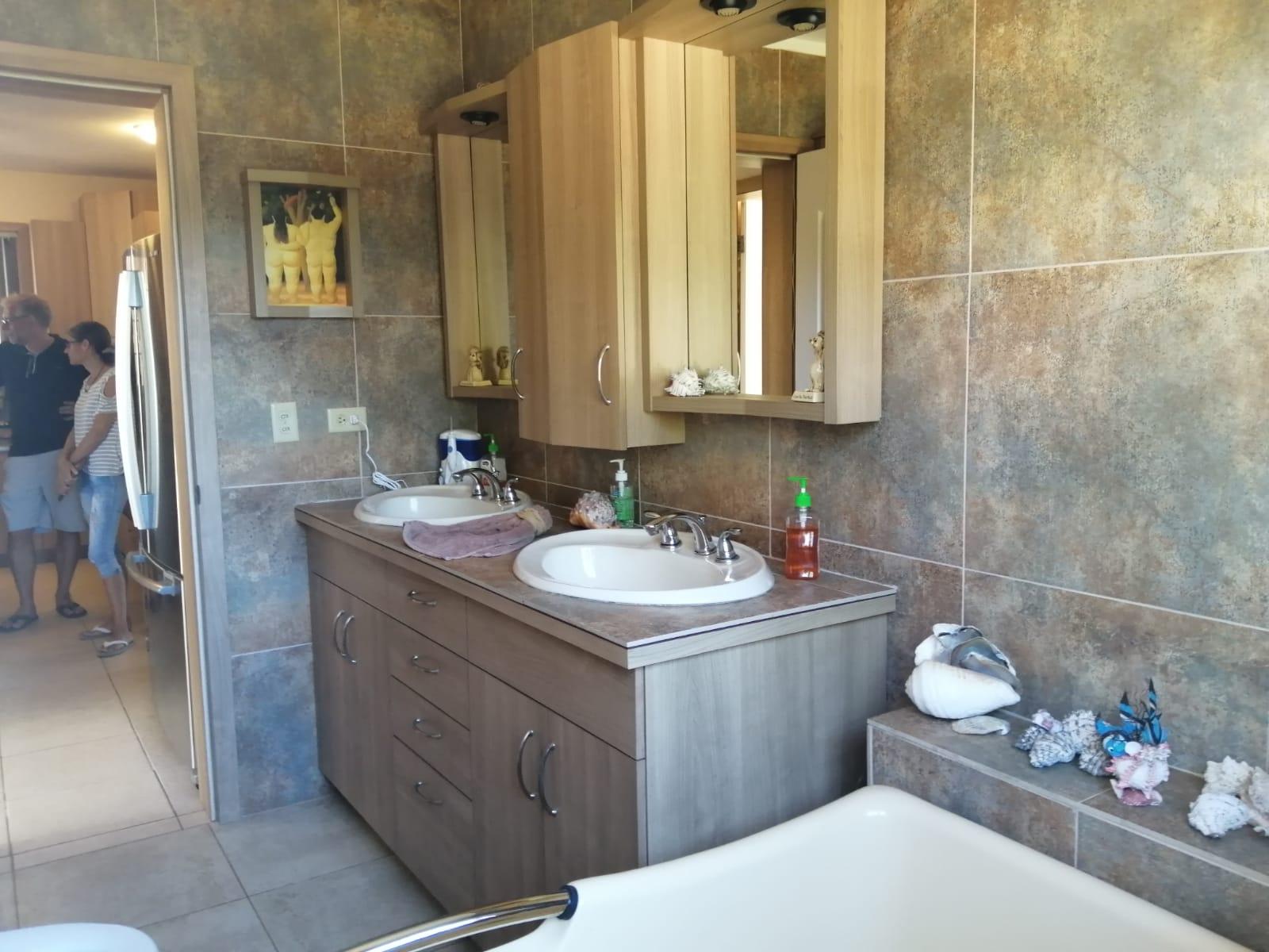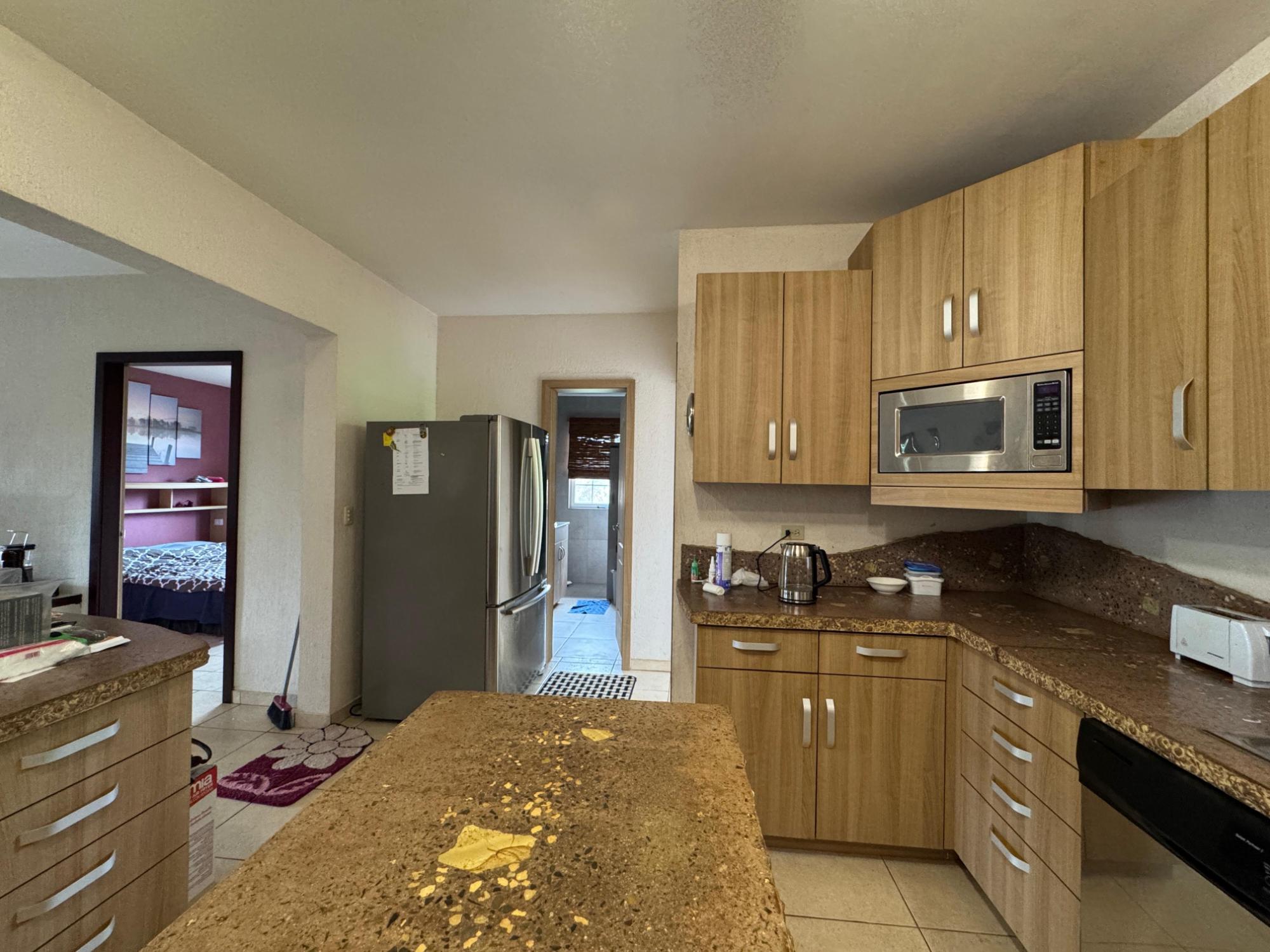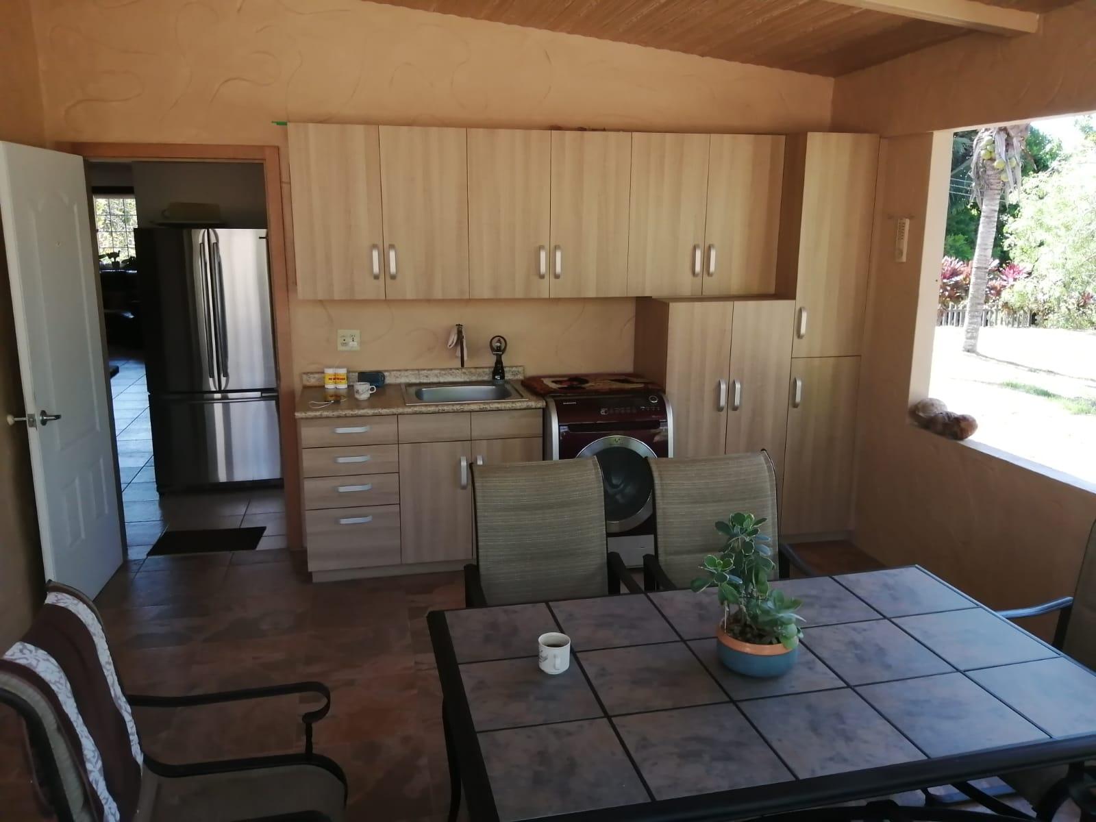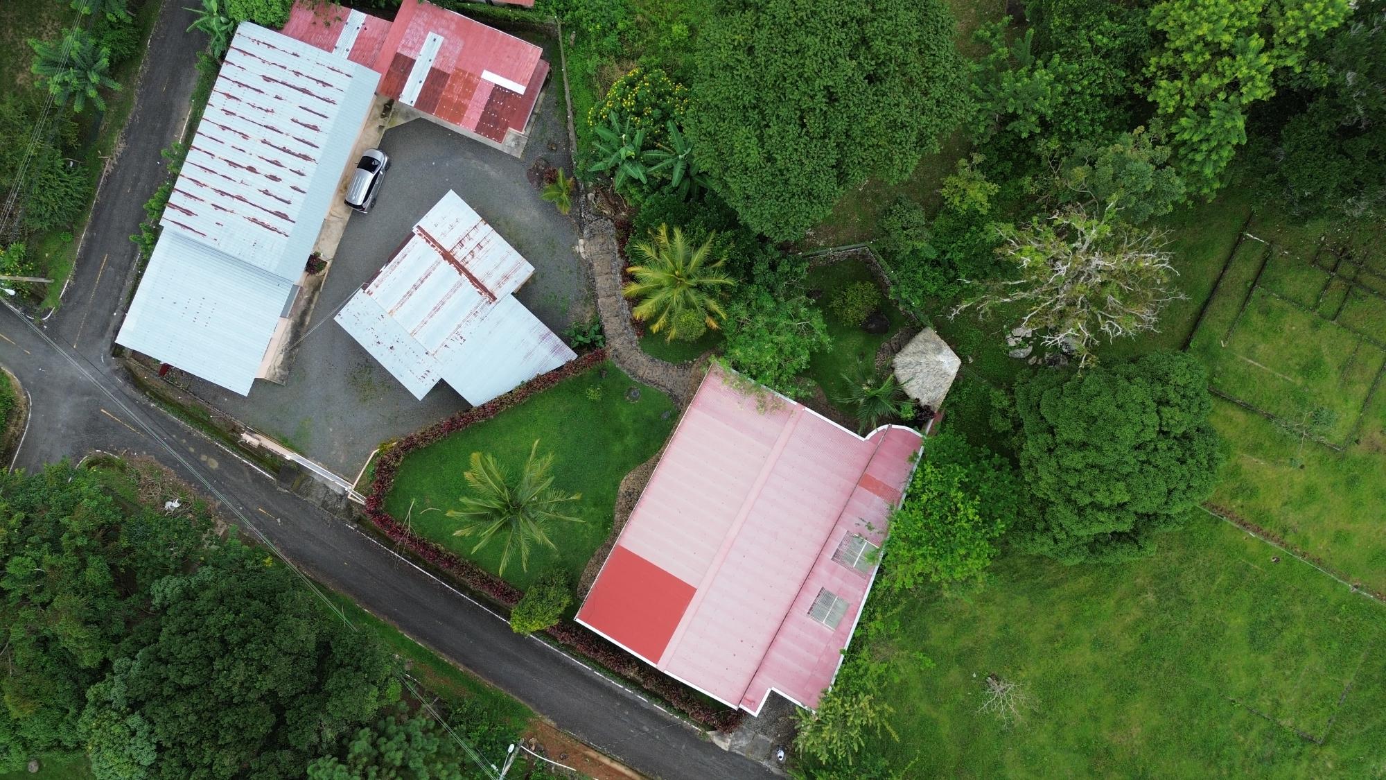 This house for sale in Sora, Chame, Panama sits about 150 meters from the Sora town park, 20 minutes from the Inter-American Highway, and 30 minutes from Coronado. The location provides quick access to supermarkets, restaurants, and medical services. The property enjoys a quiet residential atmosphere with mountain views and cooler temperatures common in this part of Panama. Property Overview The property covers 612.22 square meters of land with 307.71 square meters of construction. The layout includes the main house, a guest room, terrace, laundry area, two-car carport, and a pump room. The flat terrain allows easy access and low maintenance. The garden includes lemon and banana trees, creating a practical and pleasant outdoor space. Main House The main structure includes a living and dining room, kitchen, one bedroom, an office, and one full bathroom. The kitchen features granite countertops, a double stainless-steel sink, and modular cabinetry. PVC sliding windows bring in natural light and ventilation. Tiled floors run throughout the home, and gypsum ceilings give a clean and consistent finish. The living area connects easily to the dining and kitchen spaces, designed for comfortable everyday use. The office includes built-in furniture and large windows that open to mountain views, making it suitable for remote work or a personal project space. Guest Quarters and Additional Areas The guest room stands separate from the main house and includes a shower area with full-height wall tiles. It maintains the same solid construction quality, with PVC windows, tiled floors, and decorative wall finishes.Features