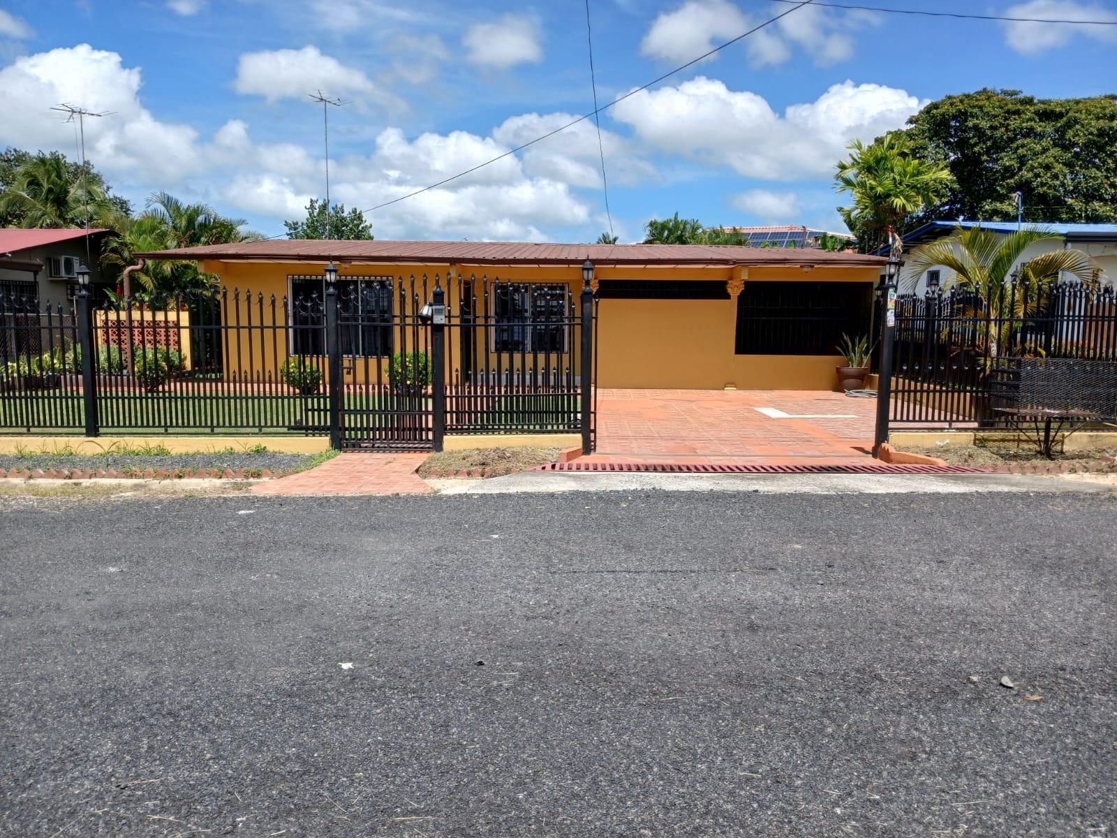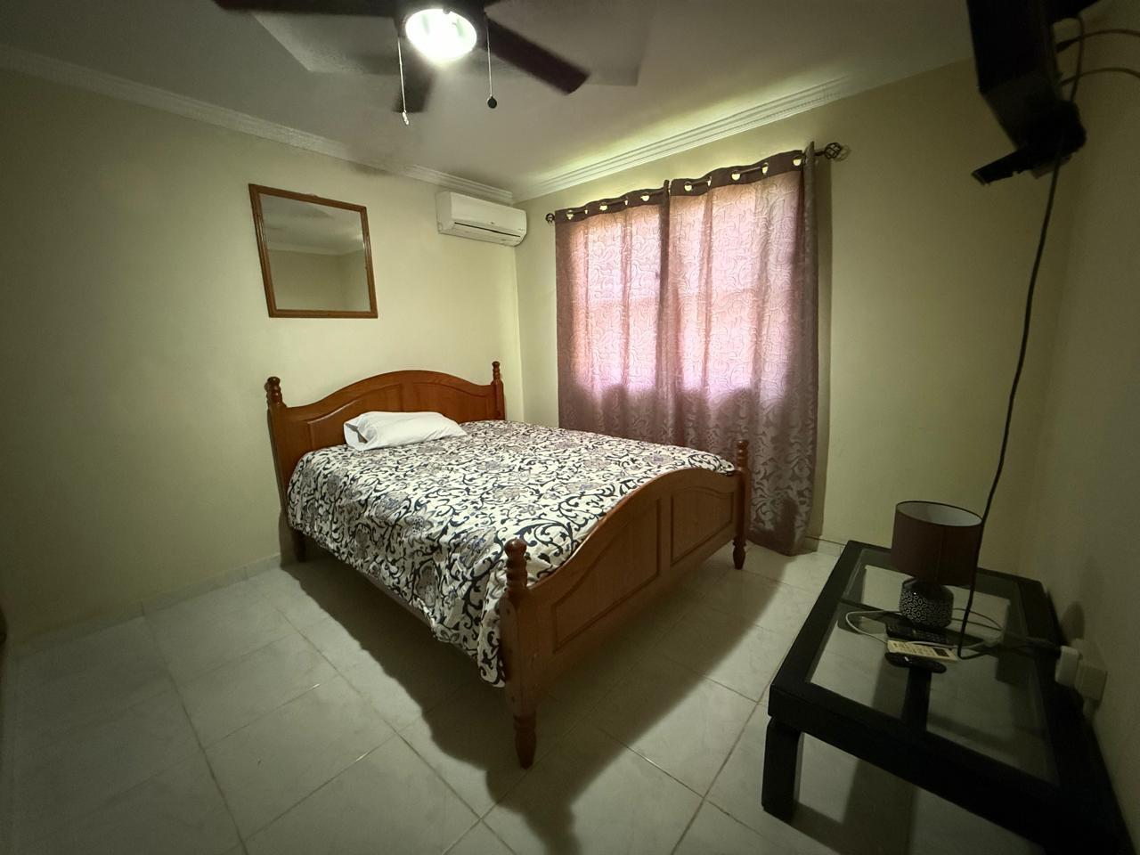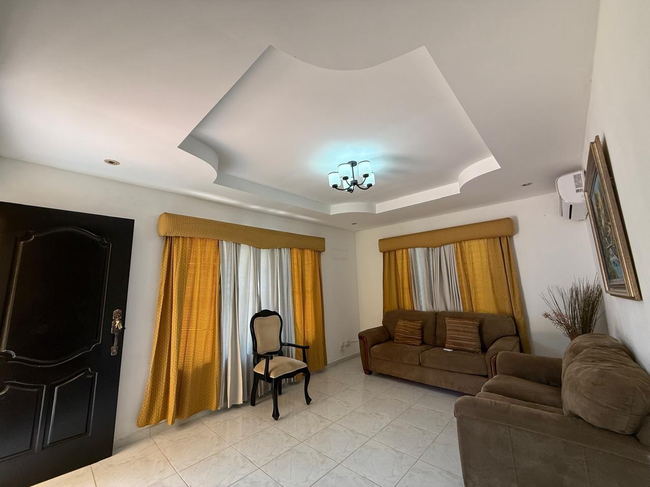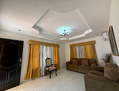 A house with 3 bedrooms, 2 bathrooms, a living-dining room, an open kitchen, a covered laundry room, a maid's quarters, and a storage room. This house has air conditioning in all bedrooms and the living-dining room, and is fully furnished and stocked with appliances. It features a good layout, a hut, and a lovely garden. It also has an electric gate and is fully fenced.Features