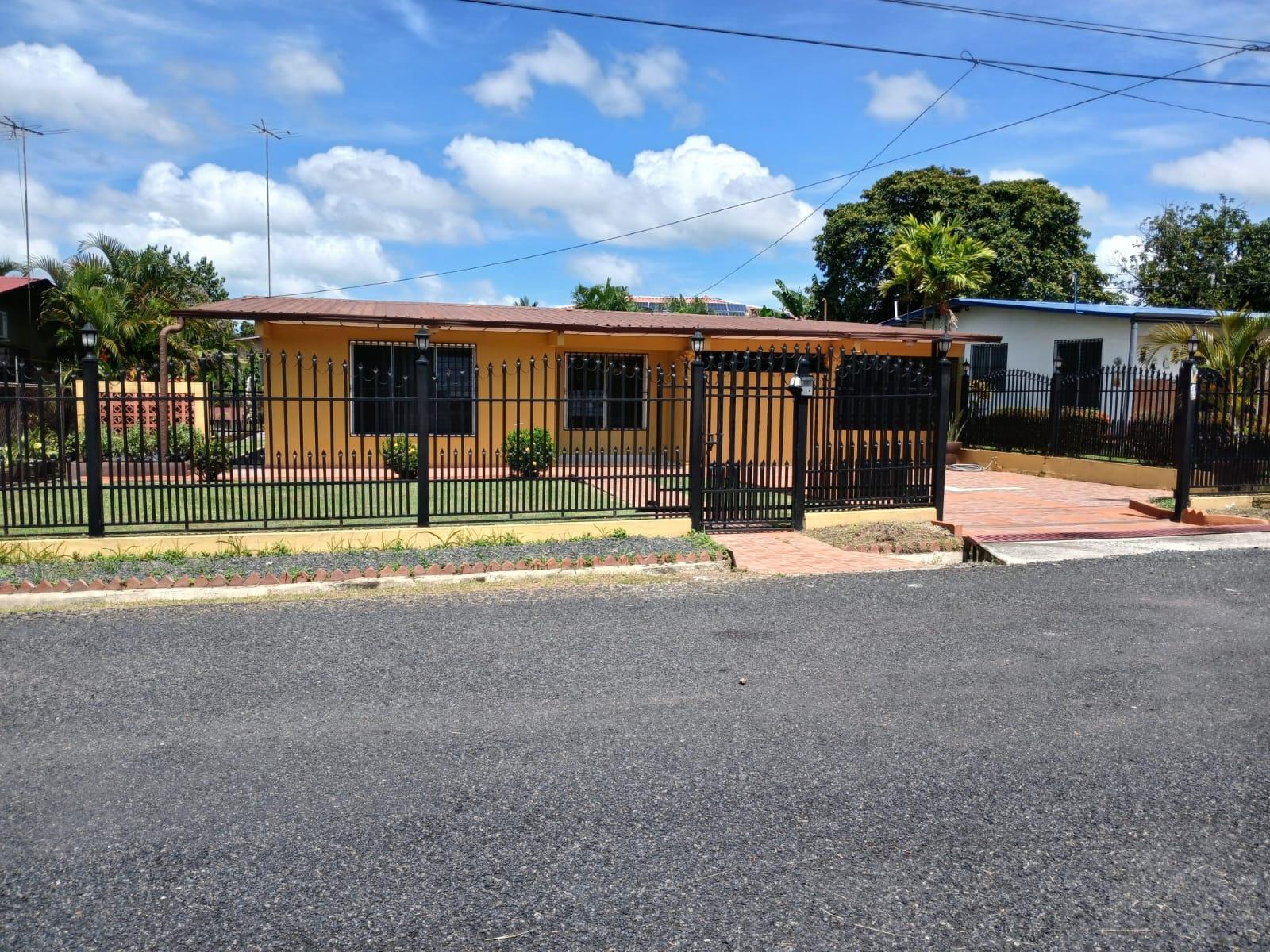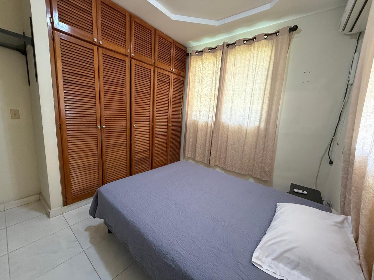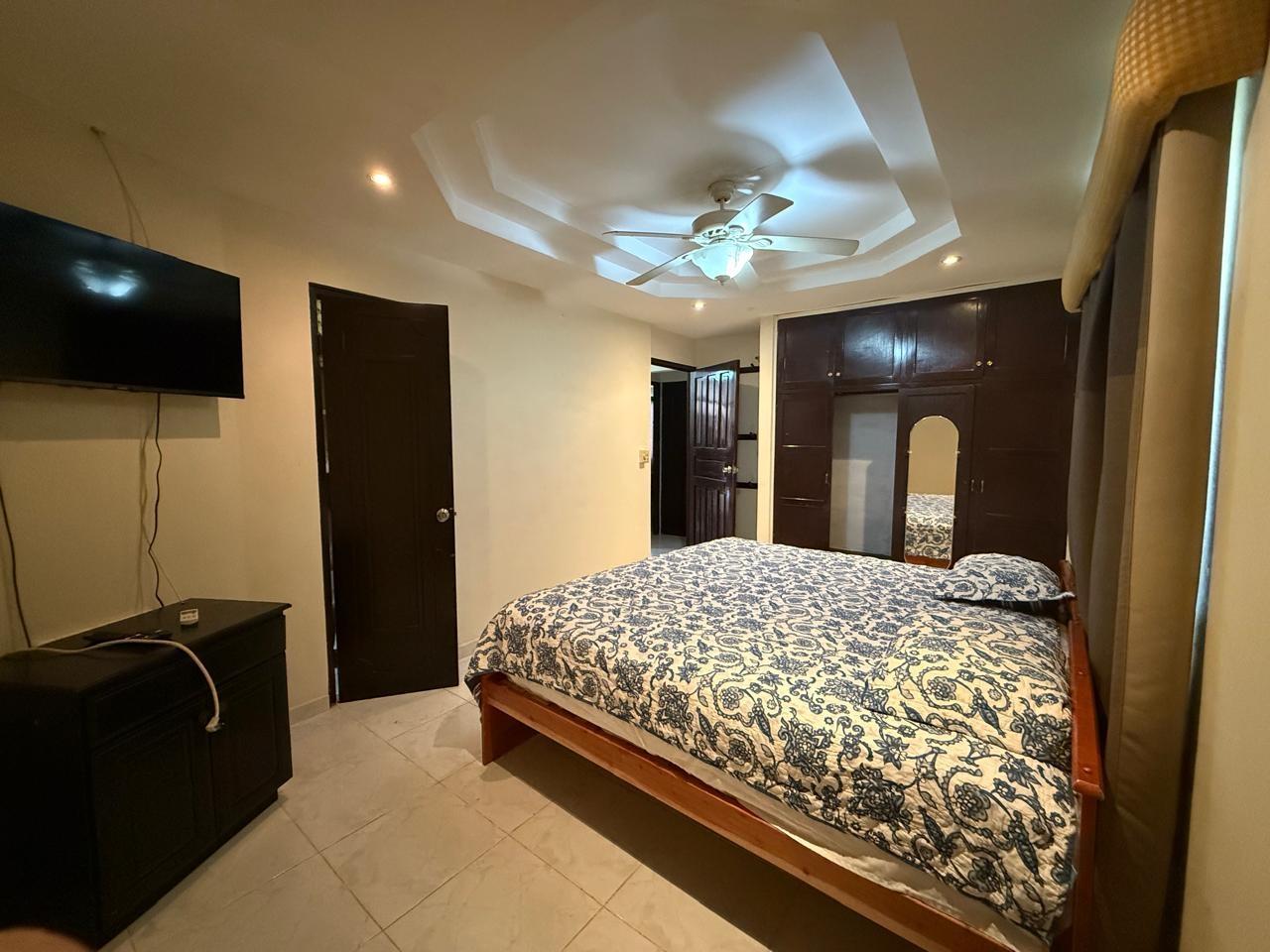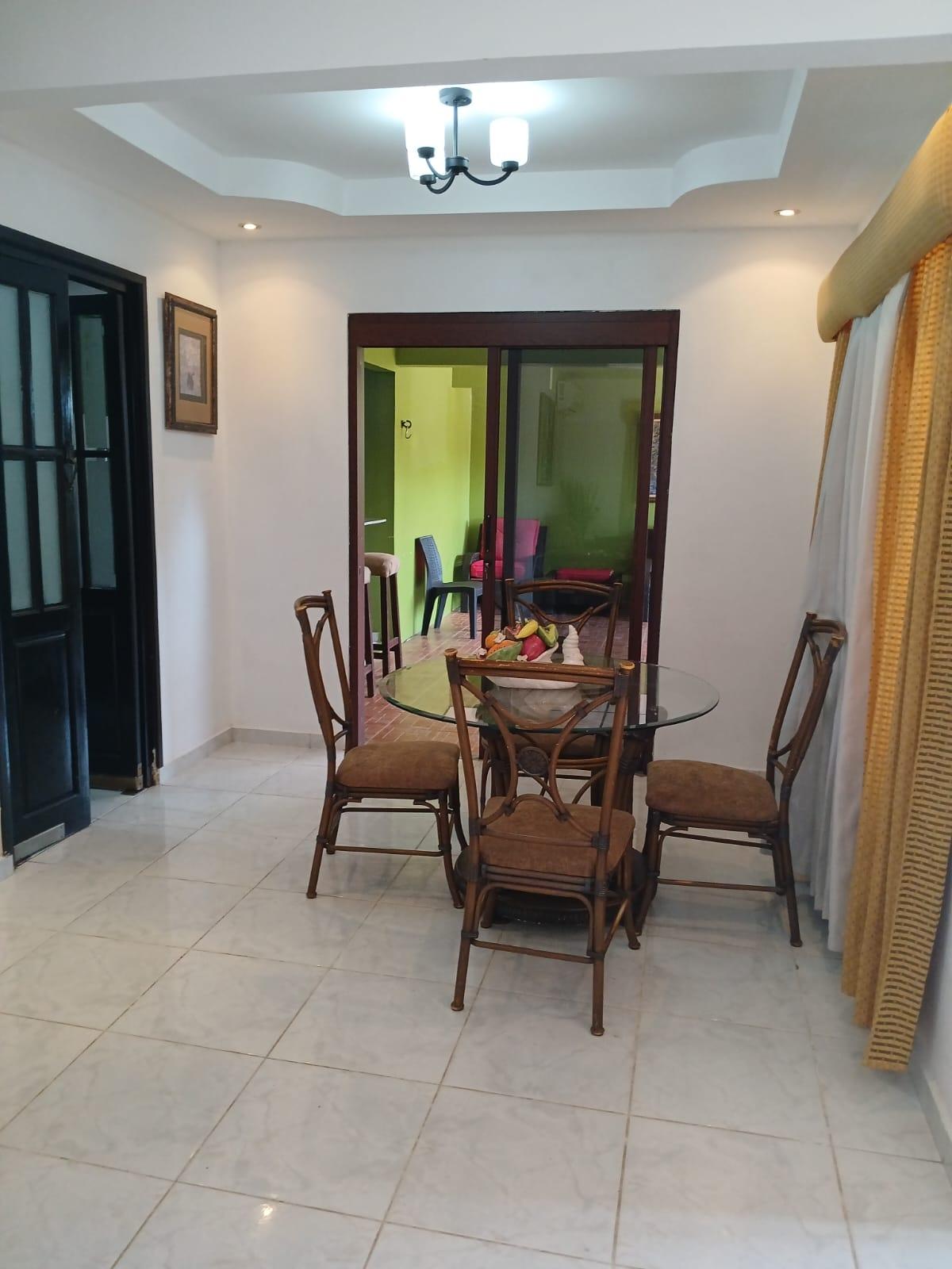 A house with 3 bedrooms, 2 bathrooms, a living-dining room, an open kitchen, a covered laundry room, a maid's quarters, and a storage room. This house has air conditioning in all bedrooms and the living-dining room, and is fully furnished and stocked with appliances. It features a good layout, a hut, and a lovely garden. It also has an electric gate and is fully fenced.Features