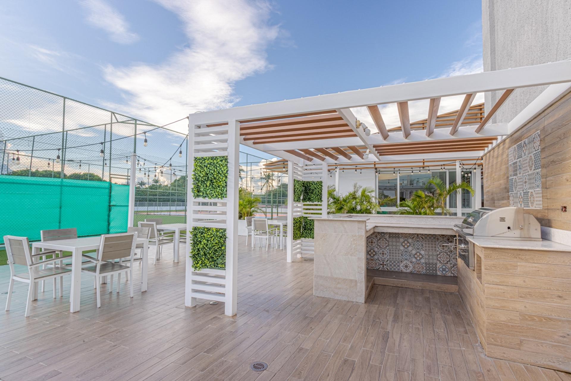 - Shared Services: Acceso silla de ruedas, Area verde, Ascensor, Cancha de futbol, Cancha de tenis, Area de juegos, Gimnasio, Sauna, Seguridad privada, Estacionamiento de Visitas, Jacuzzi, Cuarto de Juegos, Sala de Fiestas