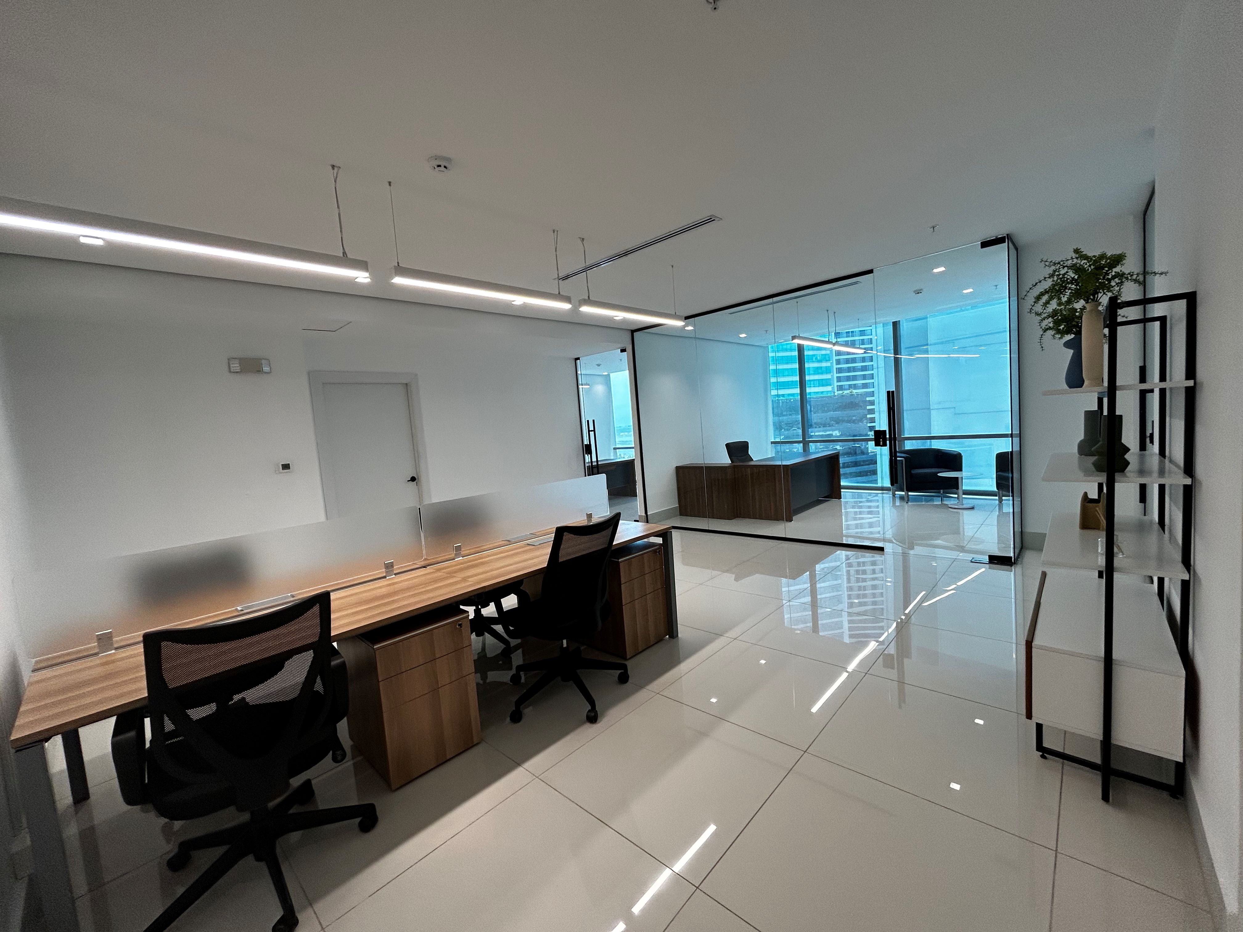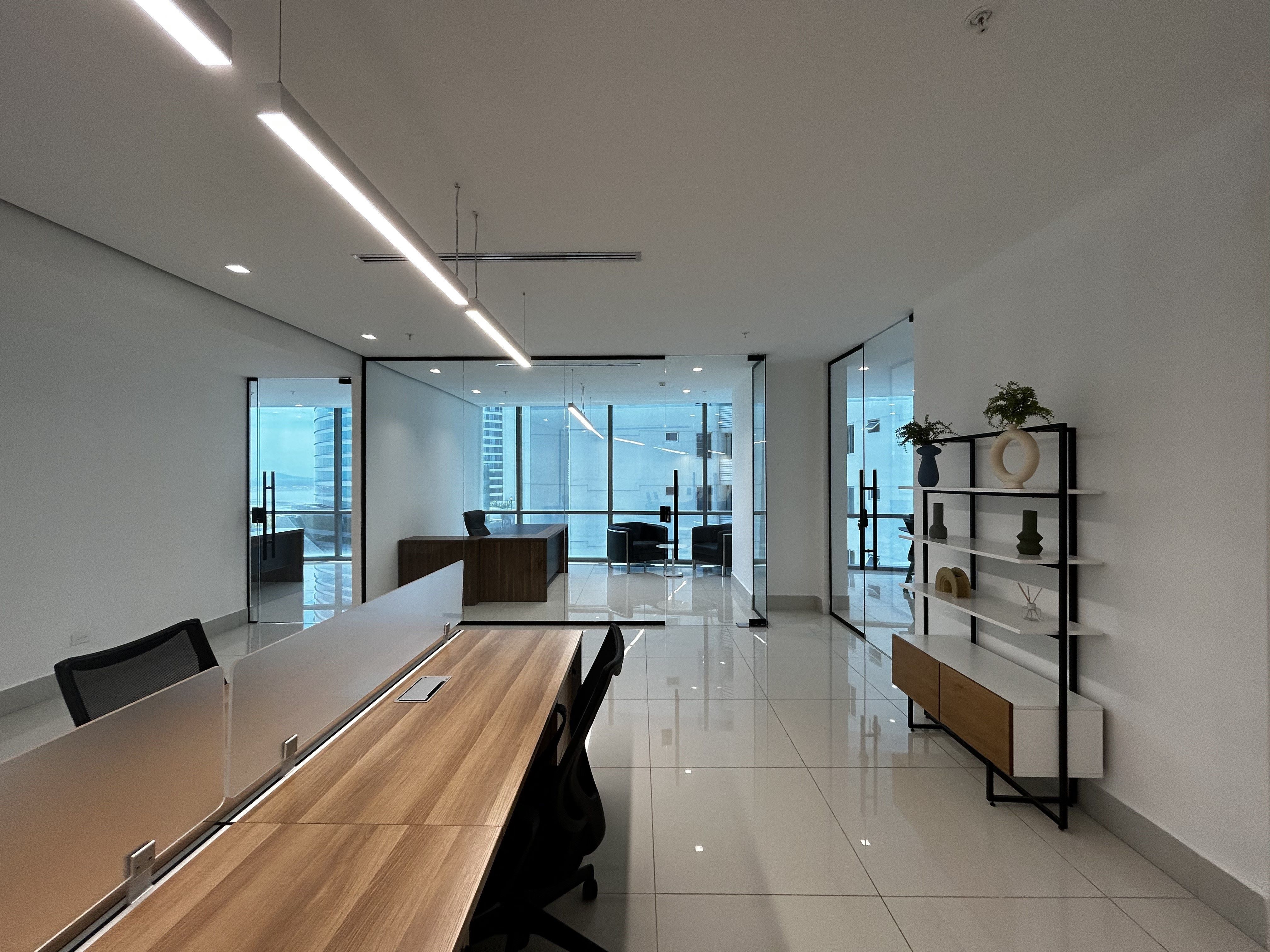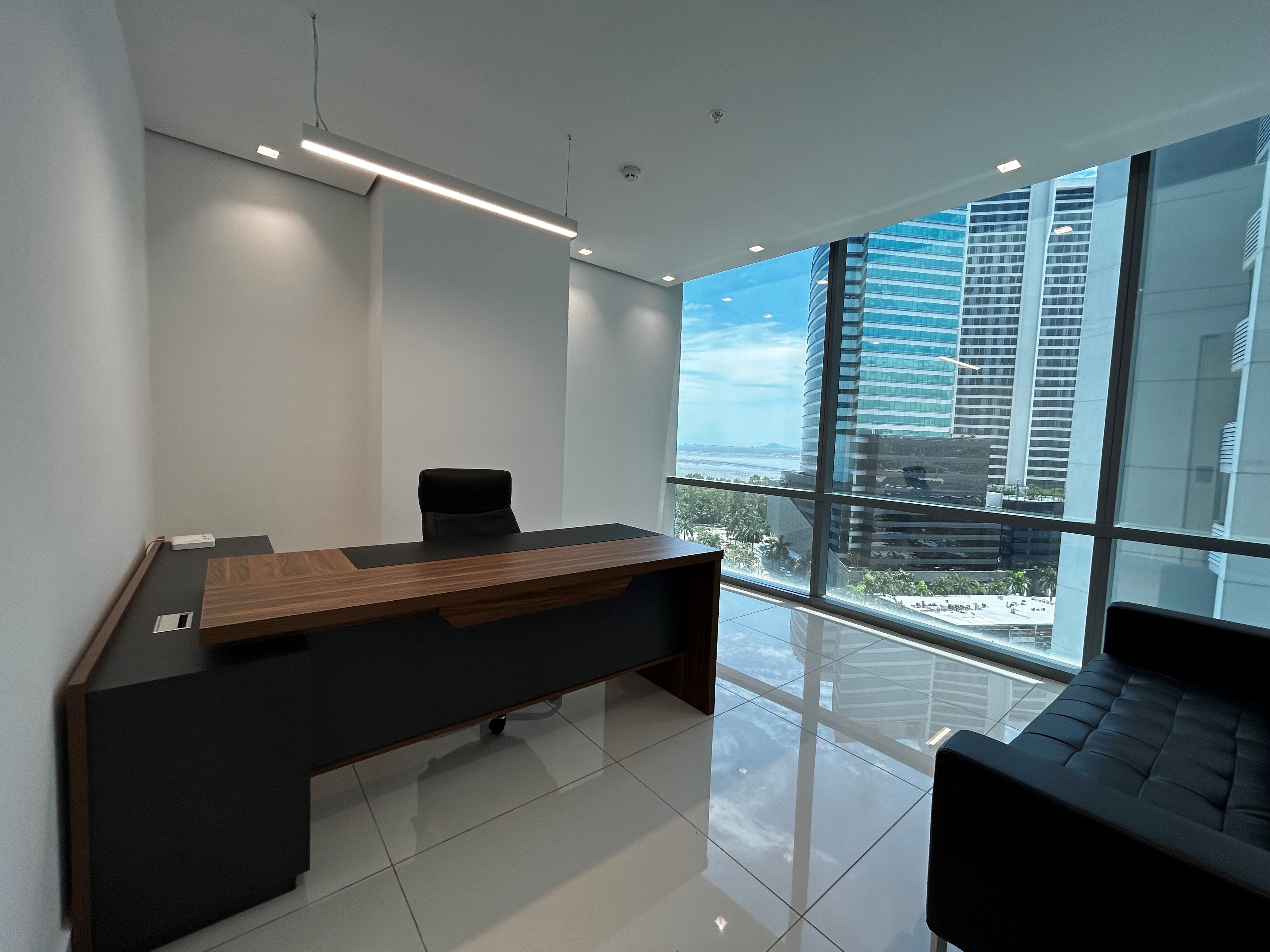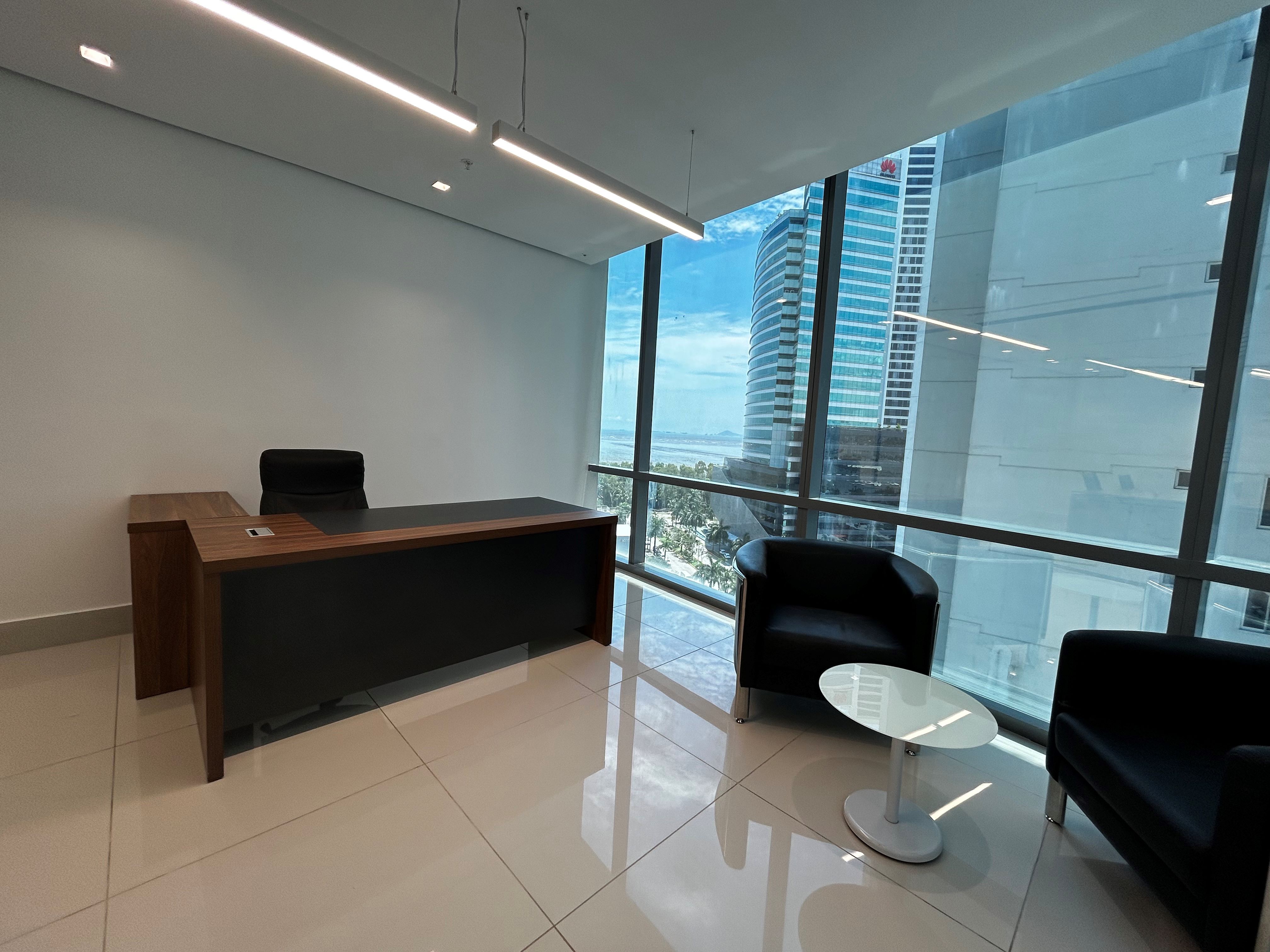 Se alquila oficina de lujo ubicada en PH Financial Park Tower totalmente amoblada, la propiedad cuenta con140 m2 , 2 puestos de estacionamientos, 1 baños, cocina, sala de reuniones, espacio de trabajo abierto y espacios privados, recepción, vista panorámicas, iluminación natural aire acondicionado lista para ocupar. Torre comercial completa con amenidades en lobby, servicio Valet Parking, ascensores de alta velocidad, ingreso Face ID, elegante e imponente lobby, seguridad en torre, estacionamientos de visitas y mucho más. Incluye Mantenimiento.Características