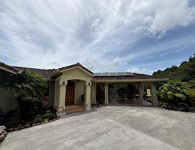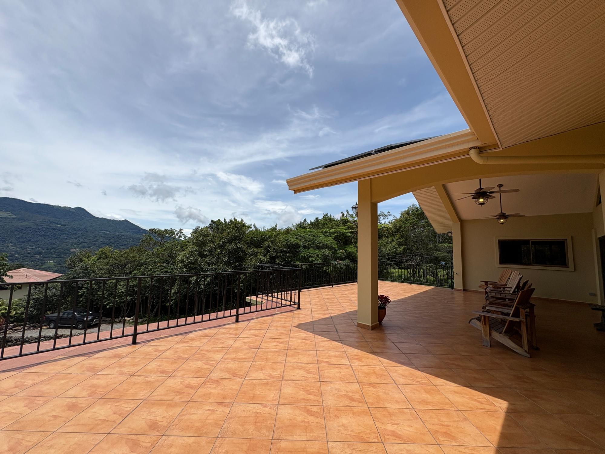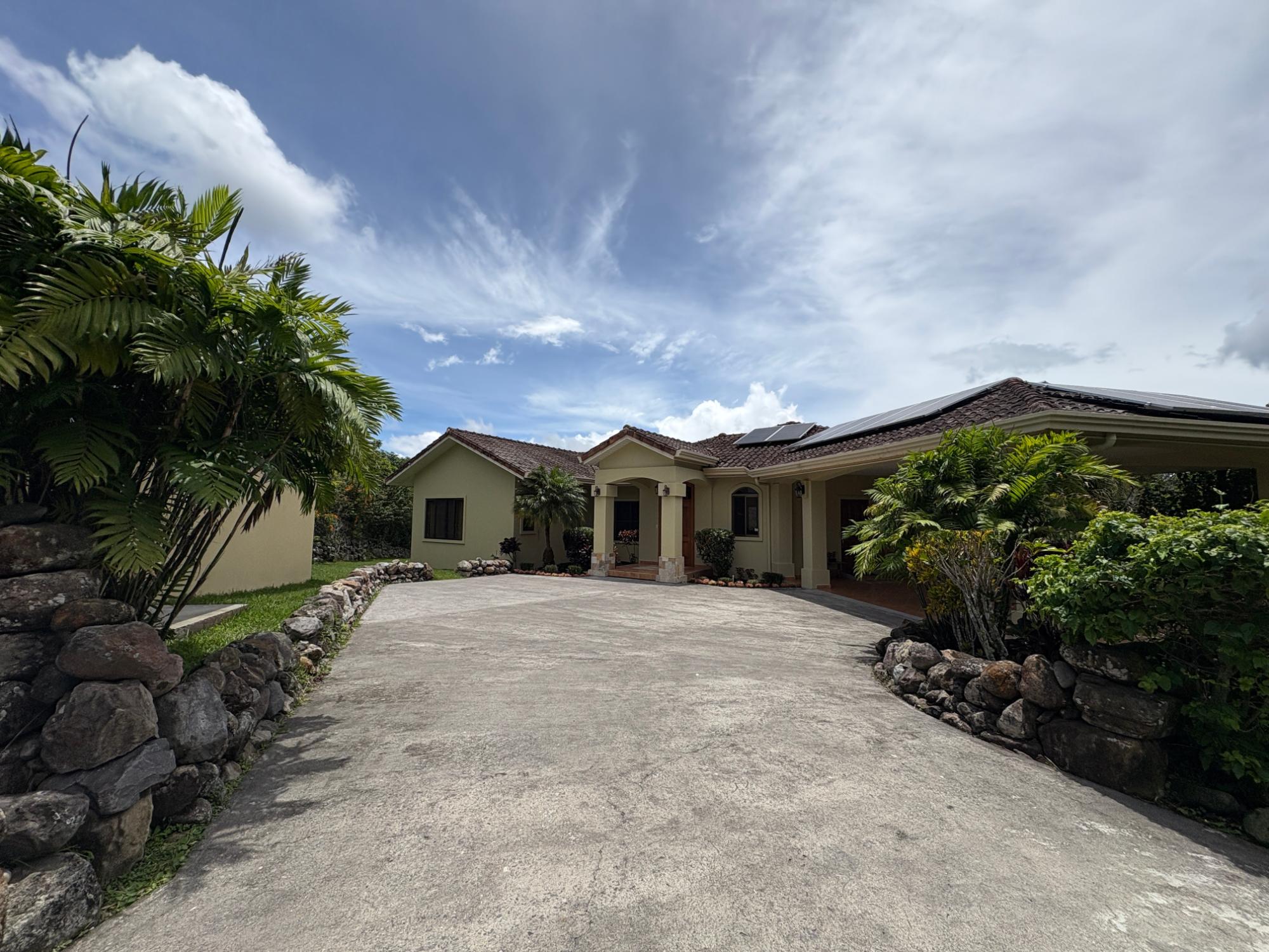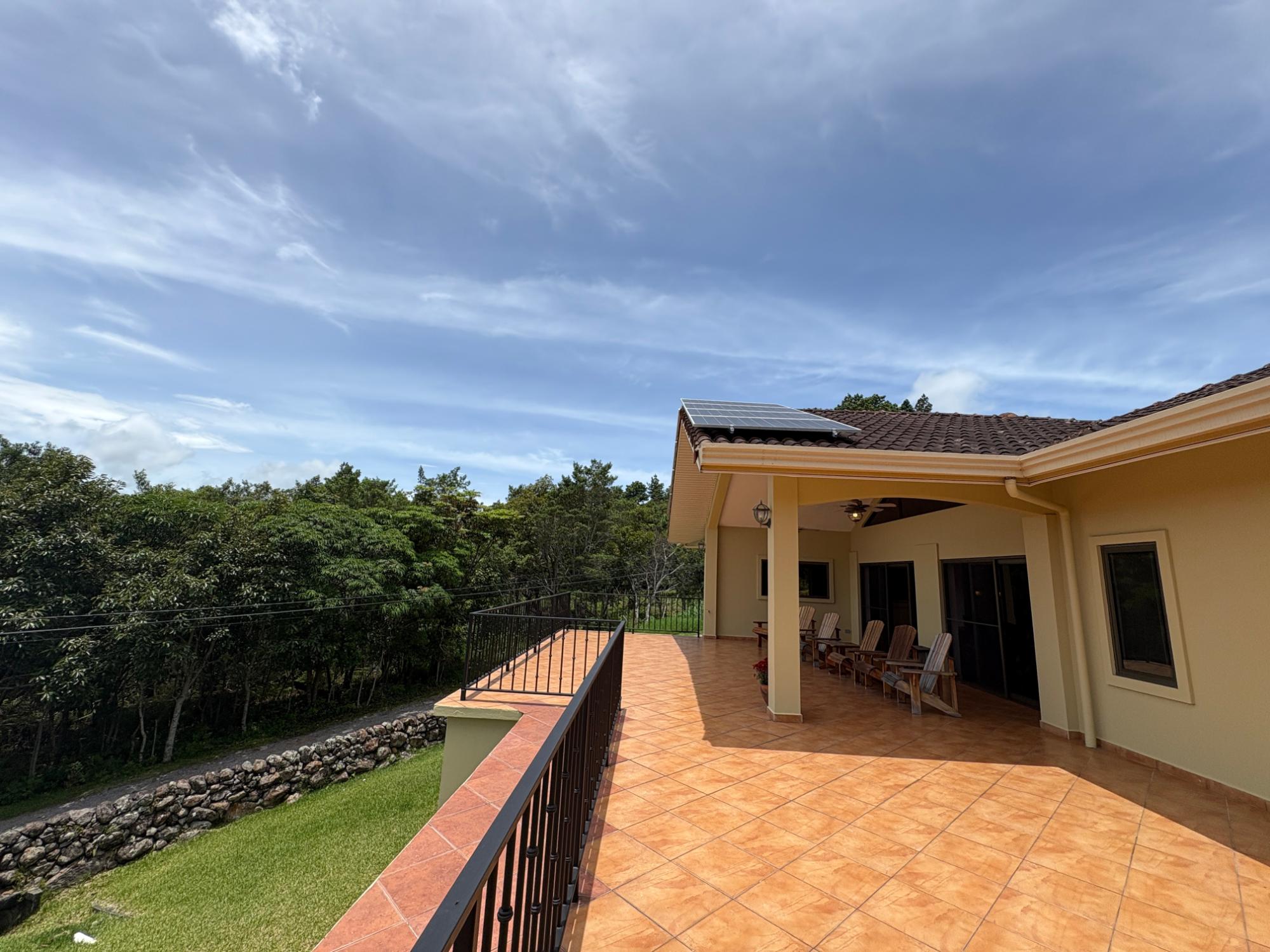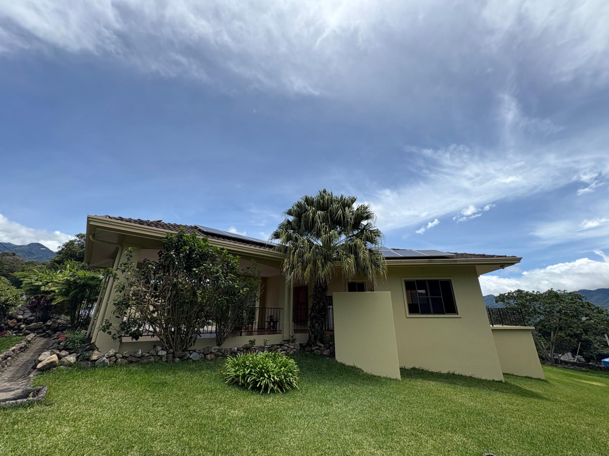 Finca con vista a la montaña, enorme terraza, casa de huéspedes, energía solar y ubicación muy deseable en venta en Volcancito, Boquete. Exención de impuestos hasta 2029. Esta inspiradora propiedad se encuentra en Urb. Los Pinos, Volcancito, a unos 10 minutos del centro de Boquete. Es una gran opción para un estilo de vida de calidad en Boquete en una ubicación excepcional. Los Pinos se considera un enclave muy deseable en un vecindario de casas de alta gama. Su microclima, accesibilidad al pueblo, ambiente y vecinos de calidad hacen de este un lugar ideal para su nuevo hogar en Boquete. Ubicada a una altitud de 1,400 metros (4,593 pies) sobre el nivel del mar, la casa se encuentra en un clima fresco y amplias vistas a las montañas en Volcancito. Volcancito es una zona muy popular de Boquete con una conveniente carretera de circunvalación, casas establecidas, fincas de café y paisajes verdes. Descripción de la propiedad Tamaño del terreno: 1,593 m² Construcción: 336.33 m² (3,620 pies cuadrados) Árboles frutales y paisajísticos: naranjos, limoneros y paisajismo decorativo Infraestructura y sistemas Sistema de paneles solares con conexión a la red Generador eléctrico de respaldo Tanque de reserva de agua Residencia principal En el exterior, los jardines y las vistas son encantadores. En el interior, la casa cuenta con una amplia sala de estar y comedor con techos altos y grandes puertas de vidrio que brindan luz natural y se abren directamente a la terraza. La vista desde la sala de estar es excepcional. La vista desde la terraza simplemente maravillosa. Uno de los aspectos más destacados de la residencia es la terraza cubierta, que extiende la sala de estar al aire libre. Este gran espacio embaldosado está diseñado para usarse durante todo el año y aprovecha al máximo las vistas panorámicas a las montañas.Características